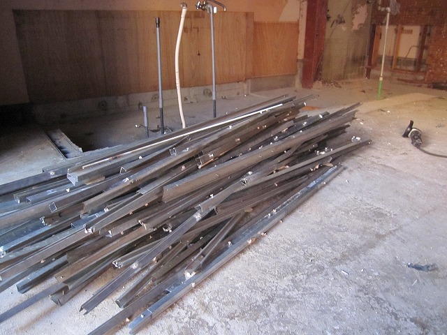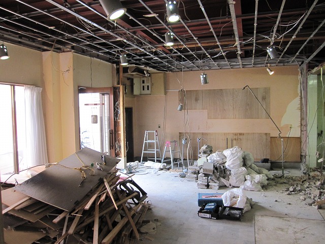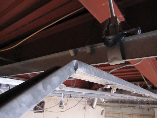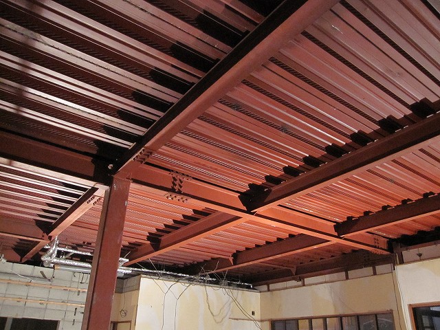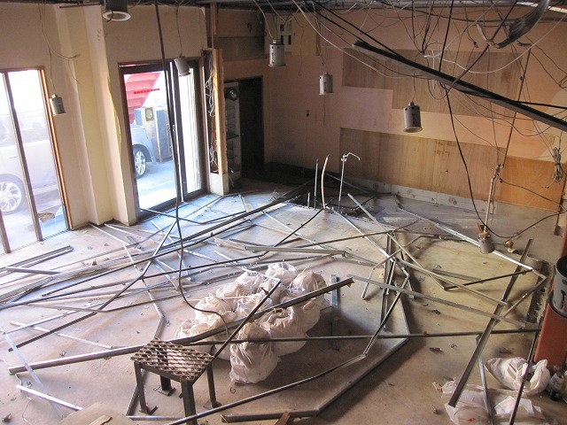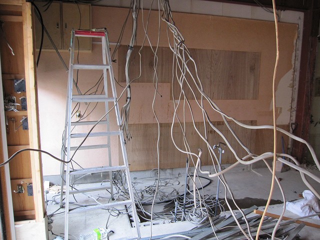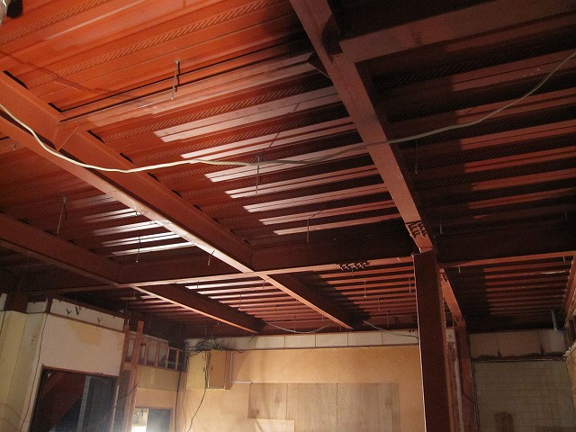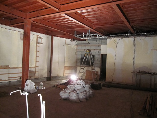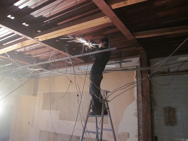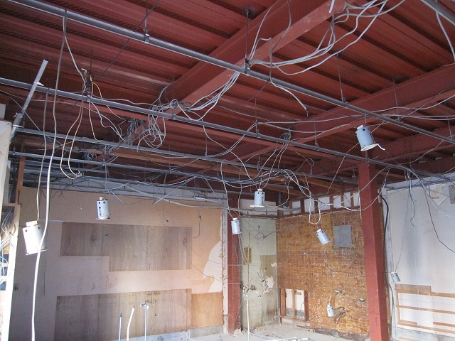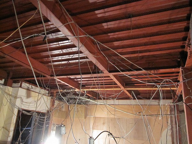 天井が張ってあった今までは、屋根裏になんとも無造作な感じで配線が巡らされていたのですが、現在は鉄骨がむき出しの状態なっています。