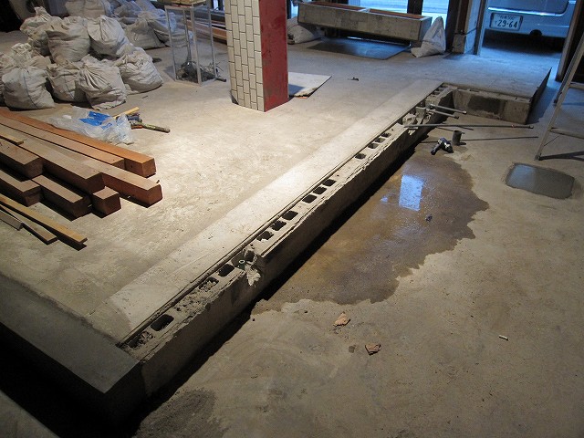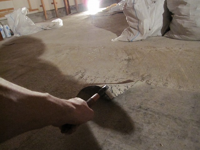 店内に投光機を取り付けて、ひっそりと床剥がしに着手。