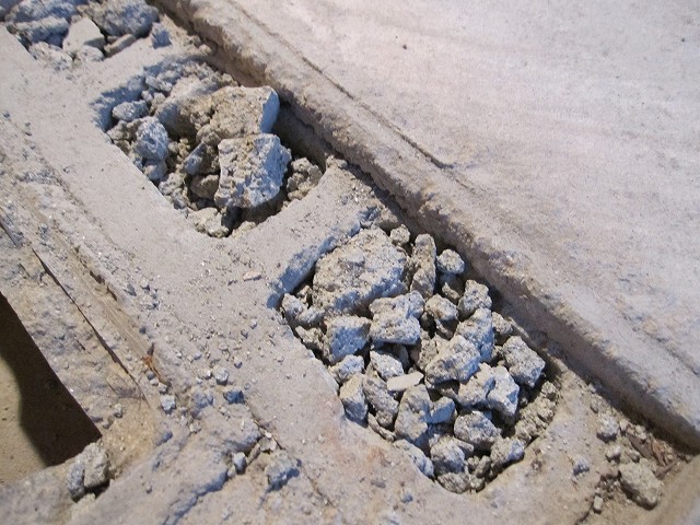 という事で、コンクリートカッターで筋を入れて地道に切削。