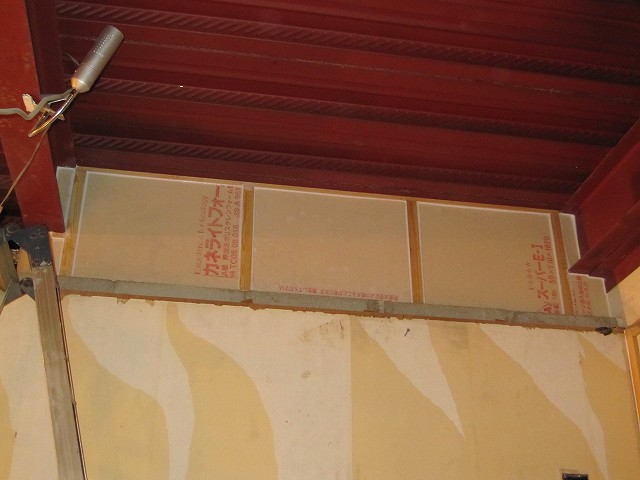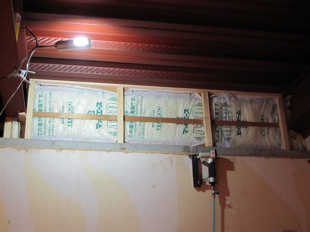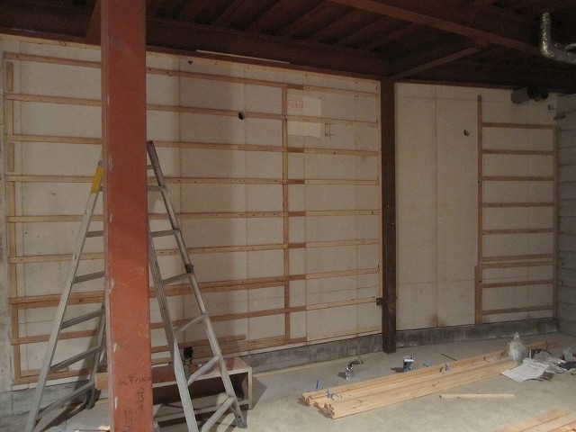 写真は石膏ボードの下に厚みのある木材を仕込んでいるところです。