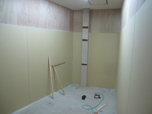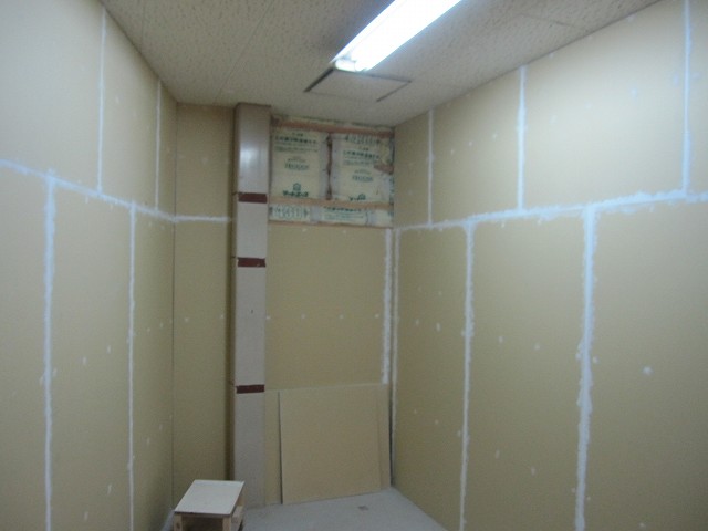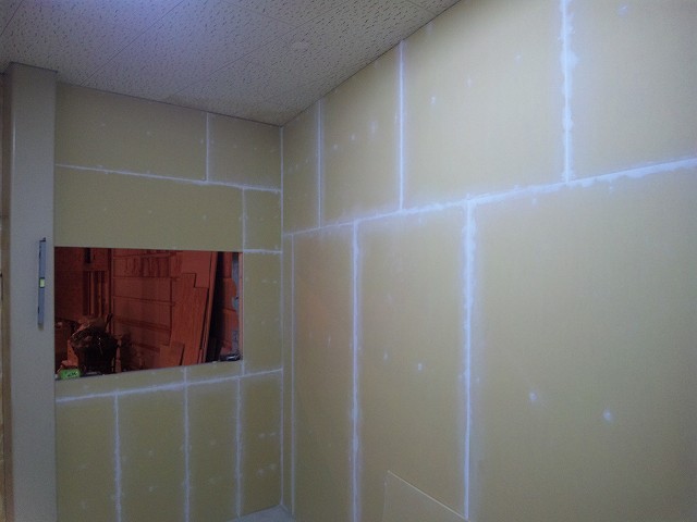 事務所内の壁はついに全ての石膏ボードを張り終えました。