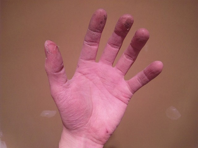 お店で働いていた頃の冬の手はもっと悲惨な状態で、表面がまるでゾウの皮膚みたいにガサガサでパンパンに腫れていましたΣ(゚Å゚)