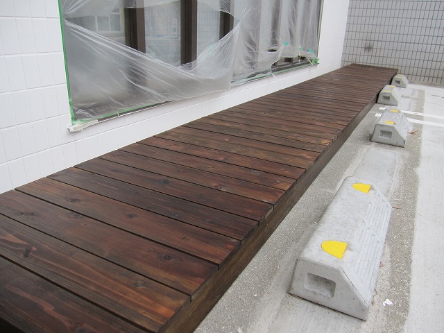 ウッドデッキに合わせて店の正面にプランターを設置します☆