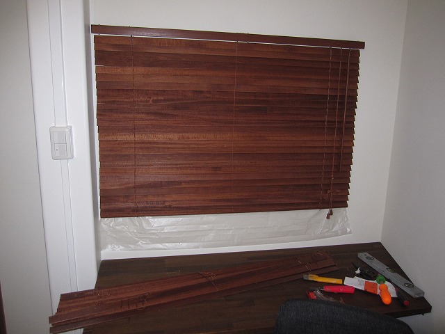 事務所に造作した窓枠と店内のガラス窓部分に木製のブラインドを取り付けました☆